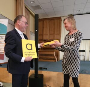 Tijdens het ledenberaad kreeg de gemeente Apeldoorn het certificaat dementievriendelijke gemeente uitgereikt door Alzheimer Oost-Veluwe. Hiermee onderstreept Apeldoorn haar inzet voor een omgeving waarin mensen met dementie en hun naasten volwaardig kunnen meedoen in de samenleving. Ook andere gemeenten in onze regio zijn hier actief mee bezig en streven er ook naar dit certificaat te behalen. Aansluitend aan de uitreiking werden wethouder Henk van den Berge (als vervangend wethouder van Anja Prins) en de belangenbehartiger van Alzheimer Oost-Veluwe nog geïnterviewd door Geert (54); een deelnemer van DemenTalent.