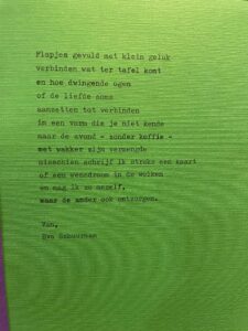 De gesprekken vormden de inspiratie voor verschillende kunstwerken. Woordkunstenares Eva Schuurman droeg tijdens de avond het gedicht RAAD voor aan de burgemeester — een waar kunstwerk dat de kern van alle avonden en gedeelde ervaringen krachtig samenvatte.