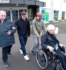 Twee jonge vrijwilligers boden spontaan een helpende hand aan een dame in een rolstoel, wat leidde tot mooie gesprekken en echte verbinding. đź’›